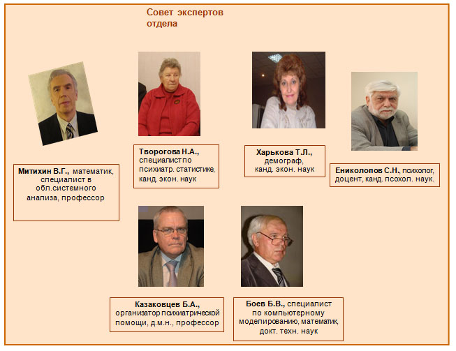 Руководитель отдела – Солохина Татьяна Александровна, доктор медицинских наук. В 1979 г. защитила кандидатскую, а в 2003 г. – докторскую диссертацию «Качество психиатрической помощи: организационные и экономические аспекты». Принимает участие в разработке программы научных основ организации психиатрической помощи, проведении экономических исследований в психиатрии, обосновании критериев качества психиатрической помощи, разработке организационно-методических основ психосоциальной реабилитации. Активно участвует в реализации общественных программ помощи и поддержки в психиатрии, председатель правления региональной благотворительной общественной организации «Семья и психическое здоровье», председатель Общественного совета по вопросам психического здоровья при Главном психиатре Минздрава РФ. Автор около 200 публикаций (в том числе в руководствах, книгах) и ряда методических пособий. Профессиональная и общественная деятельность Т.А. Солохиной отмечена рядом наград – Почетными грамотами РАМН, Минздравсоцразвития, медалью Международного благотворительного фонда «Меценаты столетия», благодарностью Комитета Совета Федерации по социальной политике, Федерального агентства научных организаций.