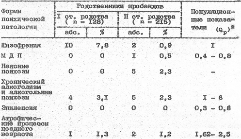 Следует отметить, что если отягощение семей контрольной выборки прогредиентными формами шизофрении рассматривалось в исследованиях И.В. Шахматовой (1972), В.Л. Шендеровой (1974), В.М.Гиндилиса (1979), то анализ отягощения этих семей паранойяльной шизофренией проведен впервые.