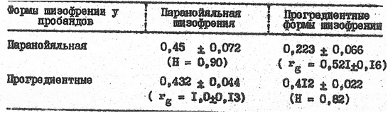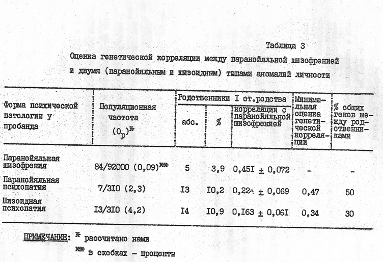 Анализ полученных таким образом генетически-информативных переменных в аспекте связи паранойяльной шизофрении с прогредиентными формами шизофренического процесса, а также психопатиями паранойяльного и шизоидного типов проведен на основе современных генетико-математических методов (генетико-корреляционный анализ).
