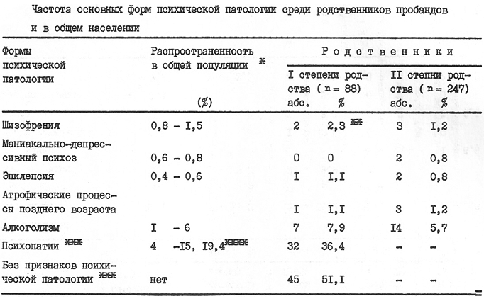 В то же время применение "семейного анамнеза" оказалось достаточным для определения частоты прогредиентных форм шизофрении, маниакально-депрессивного психоза, эпилепсии, атрофических процессов позднего возраста и хронического алкоголизма среди родственников II степени родства пробандов. Следует подчеркнуть, что генетико-математические расчеты основаны на данных о родственниках I cтепени родства.