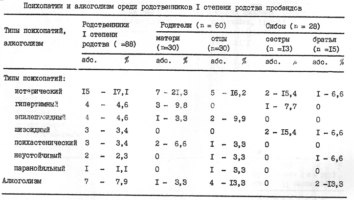 Получены сведения о 335 родственниках первой-второй степеней родства; из них - 88 - первой степени родства (60 родителей, 28 сибсов). Потомки пробандов в исследование не включались по двум причинам: во-первых, в связи с тем обстоятельством, что большинство детей (21 из 24) не достигли нижней границы возрастного риска - 15 лет; во-вторых, из-за невозможности получить информацию обо всех супругах пробандов (18 из 30 пробандов на момент обследования не состояли в браке).