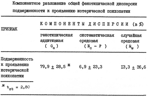 Влияние средовых факторов на проявление истерической психопатии оценивается в 20%. Из них 13% следует относить к случайным средовым, а еще 7% - к систематическим средовым. Последний показатель, согласно современным представлениям (В.М.Гиндилис, 1979), свидетельствует о внутрисемейных влияниях ("общий дом"), обуславливающих проявление изучаемого признака за счет взаимного обучения, "подражания", воспитания и т.п. в парах родственников.