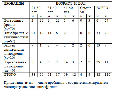 Распределение пробандов по возрасту и полу в соответствии с вариантом малопрогредиентной шизофрении приведено в табл. I, из которой видно, что соотношение мужчин и женщин по выборке в целом равномерно (82 мужчины и 110 женщин - соответственно 43% и 57%. Этот факт отражает существенную характеристику выборки.