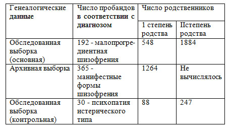 Регистрация семей проводилась путем поодиночного отбора, что исключало систематическое смещение выборки в сторону отягощенных семей. В число пробандов не включались больные в латентном периоде малопрогродиентной шизофрении, а также больные о экзогенно-органическими вредностями в анамнезе.