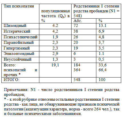 Основные формы психических заболеваний (маниакально-депрессивный психоз, эпилепсия, экзогенно-органические заболевания ЦНС, атрофические процессы позднего возраста, хронический алкоголизм и алкогольные психозы), а также суициды встречаются в семьях пробандов с той же частотой, что и среди населения.