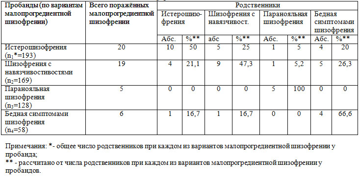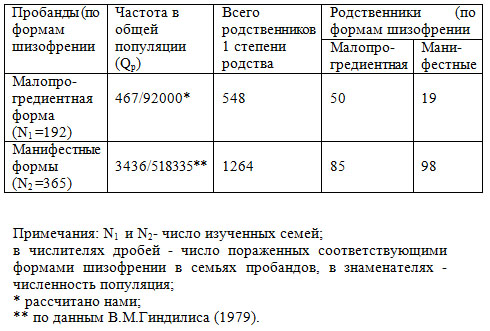 Факт накопления стертых, неманифестных форм эндогенных заболеваний в семьях больных шизофренией, впервые установленный J.Berze (1910) подтвержден в ходе последующих клинико-генетических исследований (А.Г.Галачьян, 1937; И.В.Шахматова-Павлова, 1972, 1975; M.Bleuler, 1930, 1962; H.Mitsuda, 1953, 1967; K.Planansky, 1966; D.Rosenthal, 1970, 1975; S.S.Kety, 1983). Однако, хотя необходимость анализа этих форм подчеркивается большинством исследователей, специальные работы по изучению структуры семейного отягощения при малопрогредиентной шизофрении до настоящего времени немногочисленны (В.Л.Шендерова,1974; G.K.Nyman, A.-K. Nyman, B.J.Nylander, 1978» P.H.Soloff, J.W.Mlllward, 1983; M.Вагоn et al., 1983-1985).