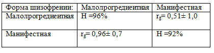 4.1 Семейная шизофрения - однотипность проявлений и характера развития болезни в парах пробанд - пораженный малопрогредиентной шизофренией родственник.