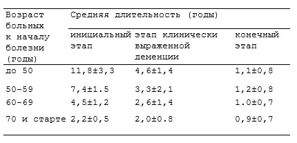 Расхождение в средней продолжительности инициального этапа у наиболее рано (до 50 лет) и наиболее поздно (после 70 лет) заболевших больных составляет более 9 лет. Сходные соотношения определяются и для этапа клинически выраженной деменции, однако различия в его средней продолжительности в крайних по возрасту начала болезни группах больных не превышают 2,6 лет. Различия в длительности конечного этапа в соответствующих группах больных составляют менее полугода.