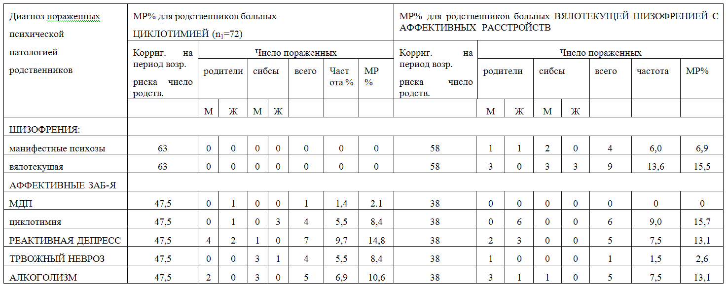 В семьях при вялотекущей шизофрении с аффективными расстройствами у пробанда происходит накопление непсихотических аффективных заболеваний, а именно - циклотимии. Частота этого расстройства среди родственников 1 степени родства составляет 9% /морбидный риск 15,7% / против 2,1% - 3,8% в популяции.