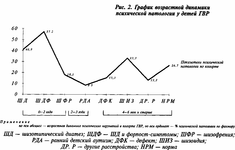 Таким образом, изучение психического здоровья у потомства раннего возраста из ГВР по шизофрении показал определенную общность природы расстройств шизофренического спектра, имеющих, по-видимому, генетическое единство, подтверждая гипотезу о реализации генетических предпосылок в зависимости от ряда условий в различные болезненные варианты — шизоидию, аффективную патологию, шизофрению, РДА и др. По-видимому, также, что РДА у потомства из ГВР тоже имеет общий этиопатогенез с другими эндогенными психическими расстройствами по всему их спектру, от предпосылок (диатеза) до степени выраженных психозов.