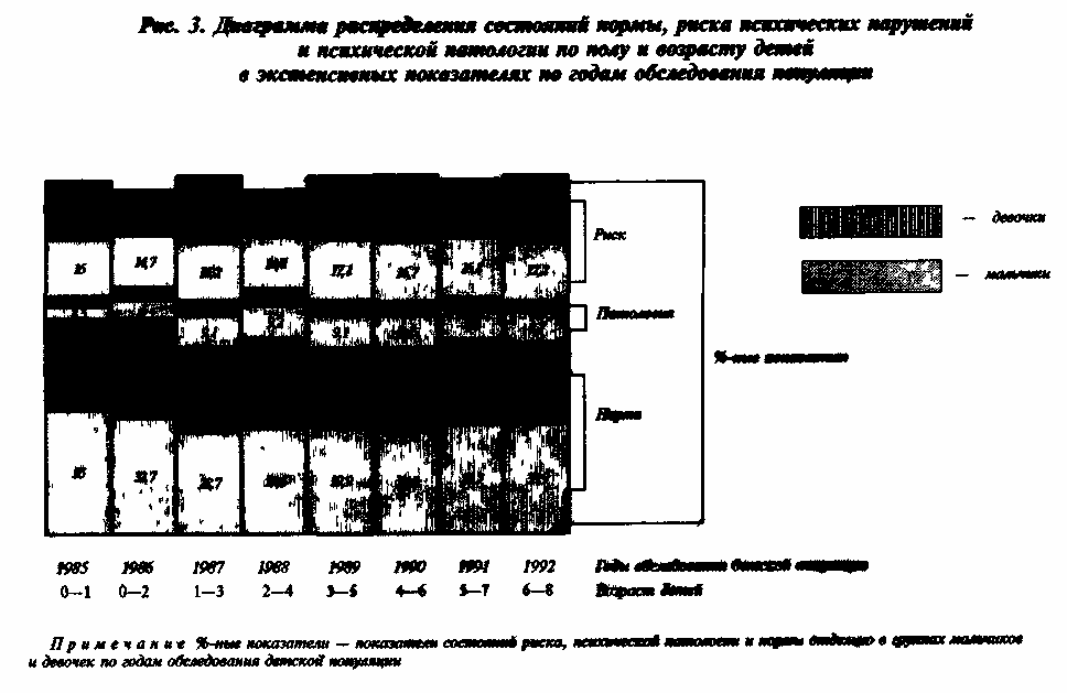 Проведенные клинико-эпидемиологические исследования контингента детей раннего возраста, изученного в динамике с 1985 по 1992 гг. безвыборочно, с углубленным перспективным анализом психического развития с первого года жизни детей, позволяли установить следующие данные: