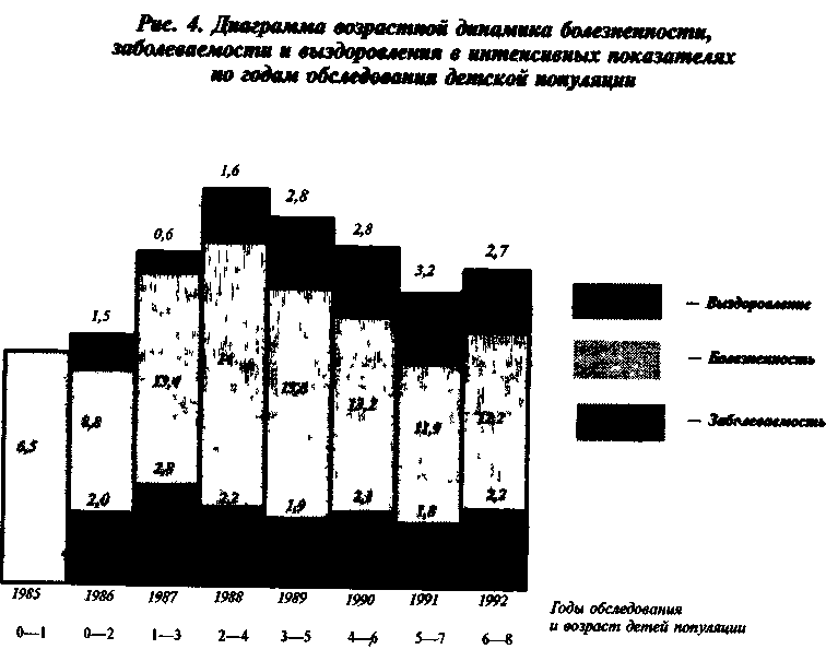 Изучая состояния повышенного риска в раннем детском возрасте, мы исходили из рабочей гипотезы, основанной на теоретических концепциях о том, что состояния предболезни (диатеза) в детской психиатрии (как и в психиатрии в целом) представляют собой некое самостоятельное явление, отличное и от болезни и от нормы (А. В. Снежневский, 1972; И. В. Давыдовский, 1992; С. Б. Семичов, 1983). Данное гипотетическое положение получило свое подтверждение в нашей работе. У значительной части обследованной популяции была обнаружена маловыраженная, но разнообразная симптоматика, не укладывающаяся в четкие границы синдромальных психопатологических расстройств. Она проявлялась на субклиническом уровне и отвечала тем критериям повышенного риска развития психиатрической патологии, которые были определены нами. Выделенная по этим критериям группа повышенного риска в популяции детей раннего возраста составила в среднем по годам наблюдения 32,1 % случаев от общего числа обследованных детей в популяции. Исследование показало, что состояния субклинического риска или предболезни, диатеза, занимали промежуточное положение между нормой и патологией и были отличны от того и от другого. Это особое состояние психического здоровья, имеющее свои механизмы возникновения и динамику. Так, например, распространенность субклинических состояний в раннем возрасте, прослеженная в динамике, была независимой от фактора пола и возраста детей. Это наглядно отличало состояния риска от патологии и сближало с нормой (где также отсутствовали существенные половозрастные отличия), но полностью не отождествляло с ней (рис. 3). Проспективное изучение выбранной популяции позволило не только определить уровень процесса заболеваемости, но и ввести новое понятие в психиатрическую эпидемиологию — выздоровление. Феномен выздоровления в нашем исследовании — это переход из состояния болезни в состояние риска или практического здоровья. Средние показатели психической заболеваемости (количество впервые заболевших за год) в популяции раннего возраста составили в год 2,1 % (по группе риска 4,7 %, по группе нормы 0,9 %), а выздоровление (количество выздоровлений за год) — 2,2 % по популяции (рис. 4). Наибольшая интенсивность заболеваемости (2,5 %) отмечена в возрастном диапазоне 3—4 лет (1987—1988 годы наблюдения) или в период первого возрастного криза. Спад ее (1,9 %) выявился после критического периода в диапазоне 4—6 лет (1989, 1990 и 1991 годы наблюдения). Характерно, что процесс выздоровления оказался в обратной зависимости от заболеваемости.