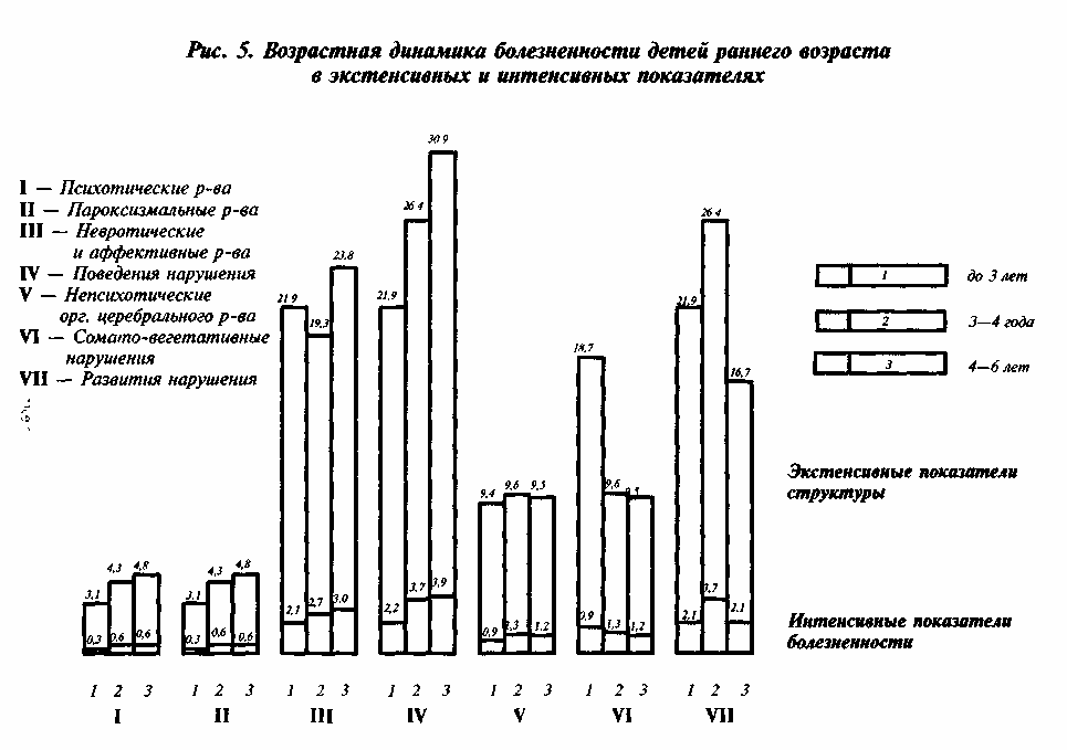 1. V детей раннего возраста, начиная с младенческого, эпидемиологически выявляется широкий круг психических нарушений (эмоциональных, поведенческих, умственного развития, речевых, двигательных психовегетативных, па-роксизмальных и др.) на пограничном и психотическом уровне в виде реакций, фаз и процессуальных расстройств. Их частота незначительно отличается от распространенности их у взрослых. Распространенность психической патологии (болезненность) у детей до 3 лет составила — 9,6 %, психическая заболеваемость — 2,1 %.