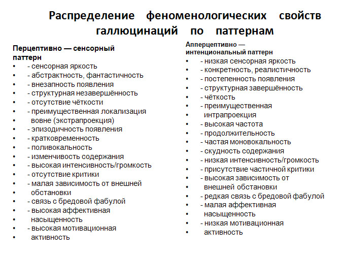 В результате был выделен перцептивно—сенсорный паттерн, который включал совокупность феноменологических свойств галлюцинаций, свидетельствовавших о ведущей роли нарушения сенсориального компонента в их патогенезе, и апперцептивно — интенциональный паттерн, который объединял особенности и свойства галлюцинаций, отражавшие доминирование в формировании галлюцинаторного феномена процесса патологически нарушенного мышления.