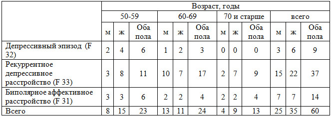 Материал исследования составляет 60 человек, в том числе 25 мужчин и 35 женщин. Средний возраст больных составил 62,9 ± 6,53 года. Все эти больные составили когорту, прослеженную на протяжении ближайшего года после купирования депрессивного приступа.