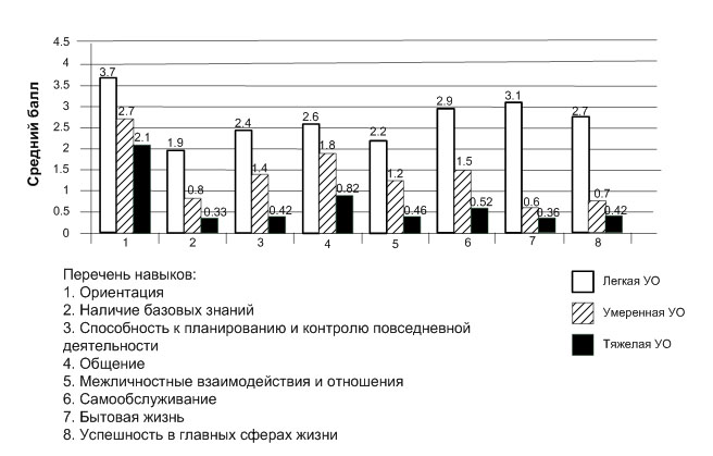 Овладение основными социальными навыками пациентами с различными степенями умственной отсталости представлено на рисунке 3. Наиболее пострадали познавательные навыки, способность к планированию и контролю повседневной деятельности, межличностные взаимодействия.