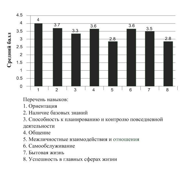 Рисунок 4. Овладение основными социальными навыками больными с органическими расстройствами (в средних баллах по «Карте регистрации навыков и умений пациента подростково-юношеского возраста»).