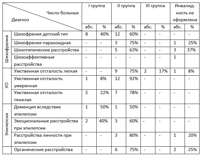 Таблица 1. Распределение обследованных больных с различными психическими заболеваниями по группам инвалидности.