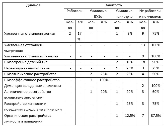 Для больных, имевших инвалидность детства в связи с органическим расстройством, были характерны достаточно высокое овладение бытовыми навыками и незначительный разброс по результатам тестовых методик; среди них не было ни одного грубо дезадаптированного пациента. В то же время, обращает на себя внимание, что хотя все инвалиды вследствие органических расстройств получили среднее образование, ни один не смог трудоустроиться, что вероятно свидетельствует о несоответствии профиля образования реальным возможностям этих пациентов и недостаточном медико-реабилитационном сопровождении данного контингента.