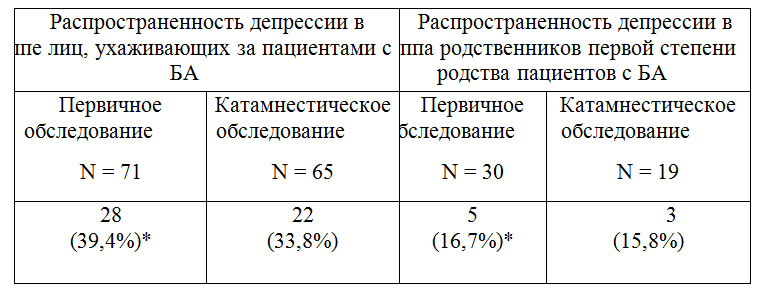 2. Распространенность депрессии у лиц, ухаживающих за пациентами с БА, выше, чем в общей пожилой популяции (39,4% и 11,0% соответственно).