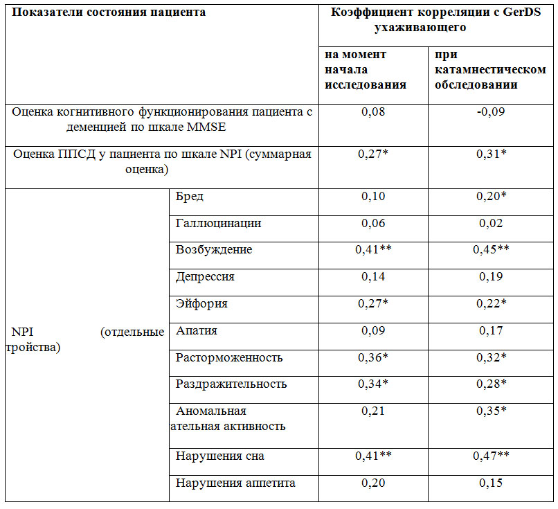 Таким образом, более выраженные психотические и поведенческие расстройства у подопечного значимо коррелируют с выраженностью депрессии у ухаживающего лица. Направленность подобной связи может быть двусторонней, то есть с одной стороны, возможно, что ухаживающее лицо, которое находится в депрессии и предрасположено к пессимистической оценке ситуации в целом, воспринимает расстройства поведения у пациента как более выраженные. С другой стороны (и такая связь, вероятно, более значима), выраженные поведенческие и психотические расстройства у пациента провоцируют депрессию ухаживающего лица и усугубляют ее.