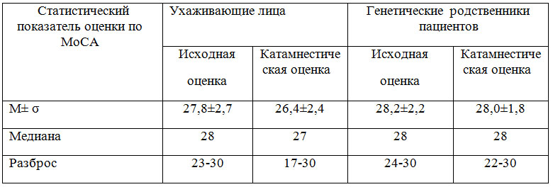 В Таблице 3 показаны результаты по шкале оценки когнитивного функционирования МоСА в изучаемых группах. Если исходно группы не различались по результатам оценки по шкале MoCA, то к моменту катамнеза различие достигло уровня статистически значимого (p<0,05). За период катамнеза оценка по шкале MoCA в группе ухаживающих лиц достоверно снизилась, тогда как в группе генетических родственников она не изменилась.