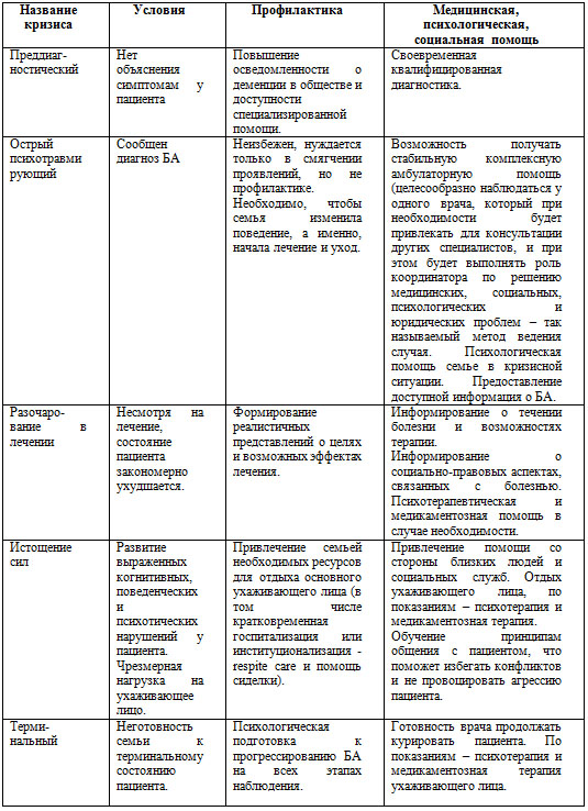 Таблица 4. Основные кризисы в состоянии лиц, ухаживающих за пациентами с БА, в ходе прогрессирования заболевания у подопечных.