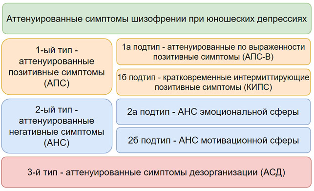 - АСШ в структуре юношеских депрессий подразделяются на следующие типологические разновидности: 1-й тип – с аттенуированными позитивными симптомами (АПС), которые включает 1а подтип с аттенуированными по выраженности позитивными симптомами (АПС-В) и 1б подтип с кратковременными интермиттирующими позитивными симптомами (КИПС); 2-й тип – с аттенуированными негативными симптомами (АНС), состоящий из двух подтипов: 2а подтип АНС с преимущественным поражением эмоциональной сферы и 2б подтип с мотивационными нарушениями, а также 3-й тип – с аттенуированными симптомами дезорганизации мышления, речии поведения (АСД).