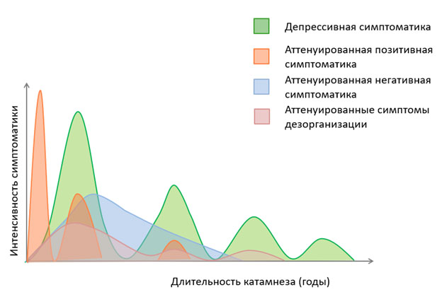 - Сочетание аффективных расстройств и аттенуированных симптомов шизофрении отличается нестойкостью и в дальнейшем подвергается динамике с формированием вектора направленности либо к аффективному, либо к шизофренического «полюсу», что определяет варианты течения заболевания и исходы;