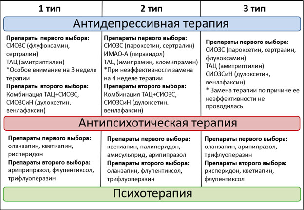 Рисунок 4. – Схема купирующего лечения больных юношескими депрессиями с АСШ по выделенным типам