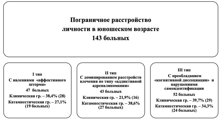Обнаруженная неравномерность распределения клинических симптомокомплексов в психопатологической структуре ПРЛ юношеского возраста позволила подтвердить предположение о гетерогенности изучаемого состояния. При сопоставлении частоты, выраженности и последовательности формирования обнаруженных психопатологических симптомокомплексов были выделены три разновидности ПРЛ в юношеском возрасте: с преобладанием эмоциональных расстройств по типу аффективного шторма [Kernberg O. F., 2003; Goodman M., 2009] — I тип; с доминированием расстройств влечения и аддиктивной адреналиномании — II тип; с явлениями когнитивной диссоциации и нарушениями самоидентификации — III тип.