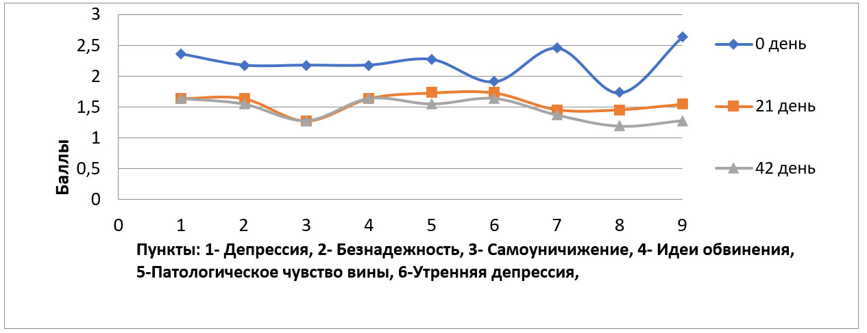 Динамика разрешения депрессивного состояния обнаруживала некоторое опережающее влияние на двигательную сферу по сравнению с тимическим компонентом. Качественное улучшение определялось как на клиническом уровне, так и по данным психометрии.