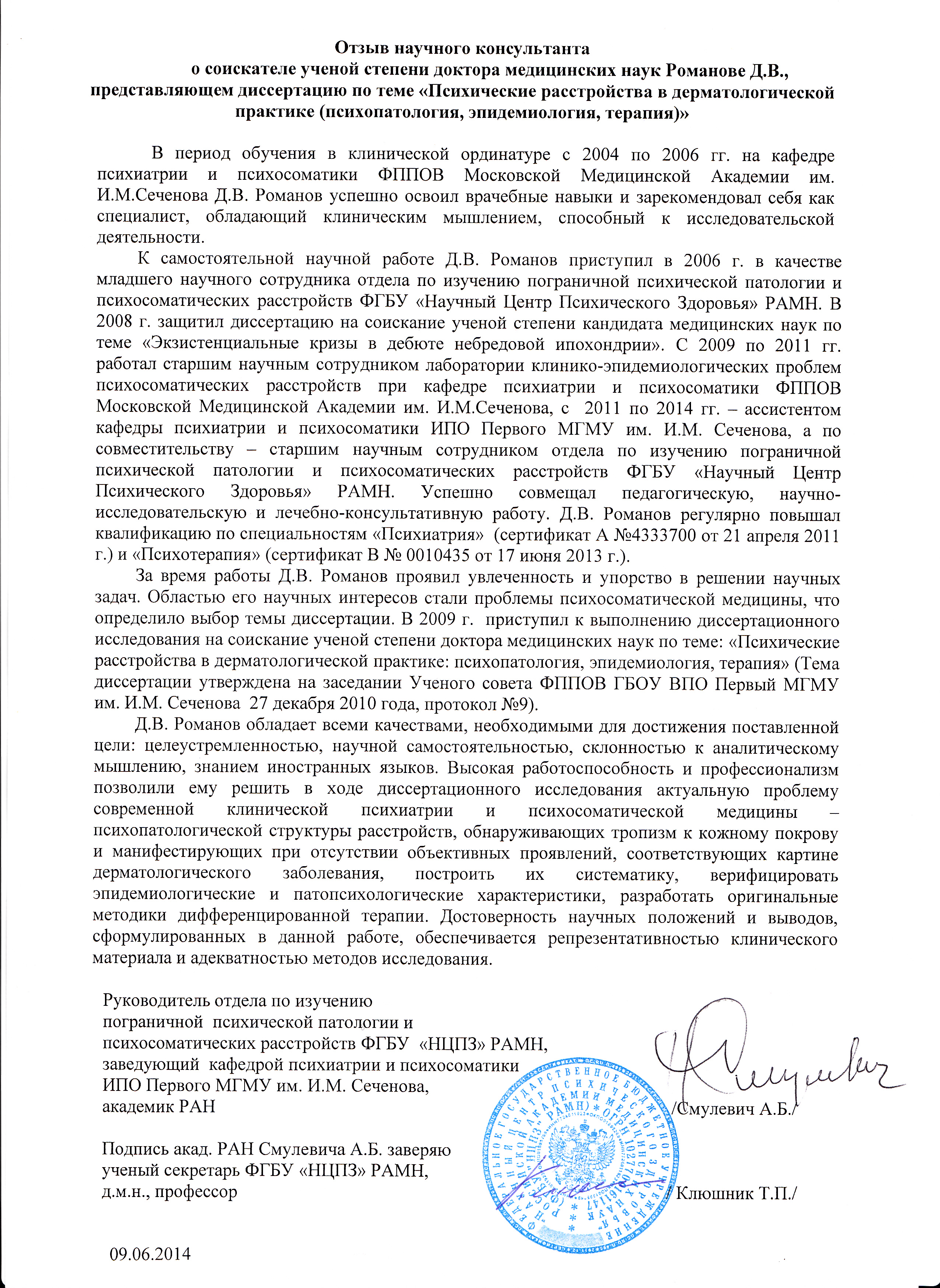 Диссертационный совет Д 001.028.01 при Федеральном государственном бюджетном учреждении «Научный центр психического здоровья» РАМН (115522, Москва, Каширское шоссе, д. 34, тел. 8-499-617-70-65) объявляет, что 30 июня 2014 года Романов Дмитрий Владимирович представил диссертацию к защите на соискание ученой степени доктора медицинских наук на тему: «Психические расстройства в дерматологической практике (психопатология, эпидемиология, терапия)», по специальностям: 14.01.06 – «Психиатрия» и 14.01.10 – «Кожные и венерические болезни», медицинские науки.