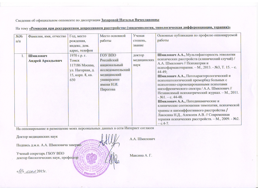 Сведения об официальном оппоненте А.А.Шмиловиче, размещены 25 мая 2015 года