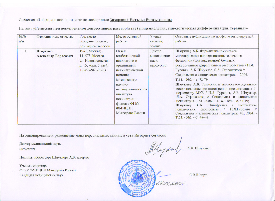 Сведения об официальном оппоненте А.Б.Шмуклере, размещены 25 мая 2015 года