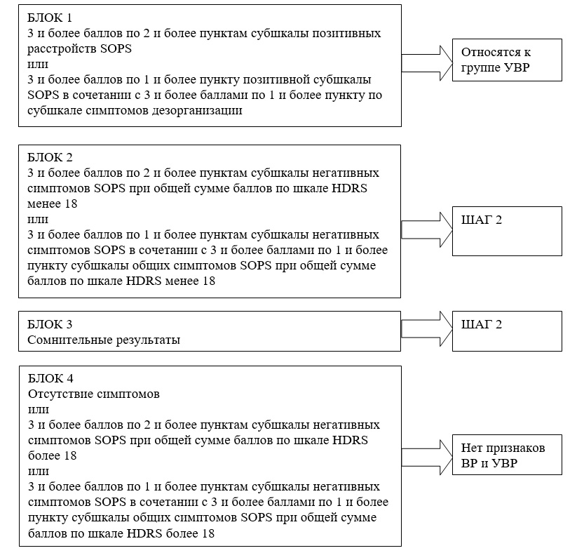 Для первичного выявления признаков УВР и ВР в указанной когорте все больные юношеского возраста с непсихотическими формами психических расстройств подлежат оценке по шкале SOPS (The Scale of Prodromal Symptoms), которая предназначена для выявления скрытой или кратковременной шизофреноподобной симптоматики на продромальном этапе. Шкала является «непсихотическим» аналогом шкалы PANSS и BPRS и позволяет оценить степень выраженности симптоматики продромального этапа по 4 направлениям: позитивные, негативные симптомы, степень дезорганизации и общие симптомы (см. Приложение 1). Признаки УВР у больных в первую очередь выявляются при оценке позитивных расстройств и являются очевидными, если их степень выраженности достигает 3 и более баллов по 2 и более пунктам позитивной субшкалы SOPS или 3 и более баллов по 1 и более пункту позитивной субшкалы SOPS в сочетании с 3 и более баллами по 1 и более пункту по субшкале симптомов общей дезорганизации. Указанные расстройства представлены преимущественно напряженным или бредовым настроением, неперсекуторными идеями отношения, нарушениями функции мышления с жалобами на наплыв и обрыв мыслей, отчетливой подозрительностью, настороженностью или недоверчивостью, необычными сенсорными явлениями, такими как искажение или притупления чувств, яркие представления и иллюзии, а также неопределенностью, метафоричностью речи с растормаживанием ассоциативного процесса. У больных возникают мысли необычного содержания, убеждения сверхценного характера преимущественно на религиозные, философские и другие экзистенциальные темы, магическое мышления с поиском скрытой связи между происходящими событиями, открытием «шестого чувства». Может сформироваться отчетливое бредовое настроение, изменение восприятия времени, явления дежа вю, патогномоничные нарушения мышления в виде наплывов и обрывов мыслей. Появляется несвойственная больным ранее настороженность в общении с посторонними людьми, возникает смутное ощущение опасности, угрозы. Имеющаяся симптоматика оказывает влияние на поведение с ограничением пользования общественным транспортом, отказом от выхода на улицу в темное время суток. Речь становится нецеленаправленной, суждения путаными, нарушается процесс установления логических связей между явлениями. В некоторых случаях выявляются отчетливые идеи отношения, сопровождающиеся подозрительностью, открытой недоверчивостью, враждебностью, что отражается на общении и поведении. Пациенты эпизодически высказывают бредовые идеи внешнего контроля, получения посланий посредством радио- и телепередач. Убеждения отличаются непостоянством и не достигают степени систематизированных. Больные отмечают искажения сенсорного восприятия, могут возникать необычные, неоформленные расстройства в перцептивной сфере (шумы, вспышки), что сопровождается беспокойством и аффектом недоумения. Мышление становится паралогичным, стереотипным, бесцельным, отмечаются частые соскальзывания, возникают неожиданные ассоциации. Симптомы дезорганизации проявляются странностями поведения с импульсивностью, неадекватным ситуации аффектом, диспластичностью с изменениями поведения, чудачеством, несоблюдением социальных норм, пренебрежением гигиеной, неухоженностью, а также несвойственной ранее манерностью и позерством.