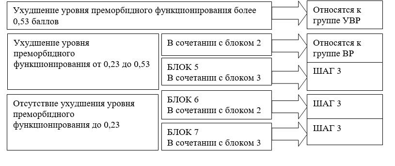Алгоритм пошагового выявления признаков УВР и ВР в когорте больных юношеского возраста с непсихотическими формами психических расстройств.